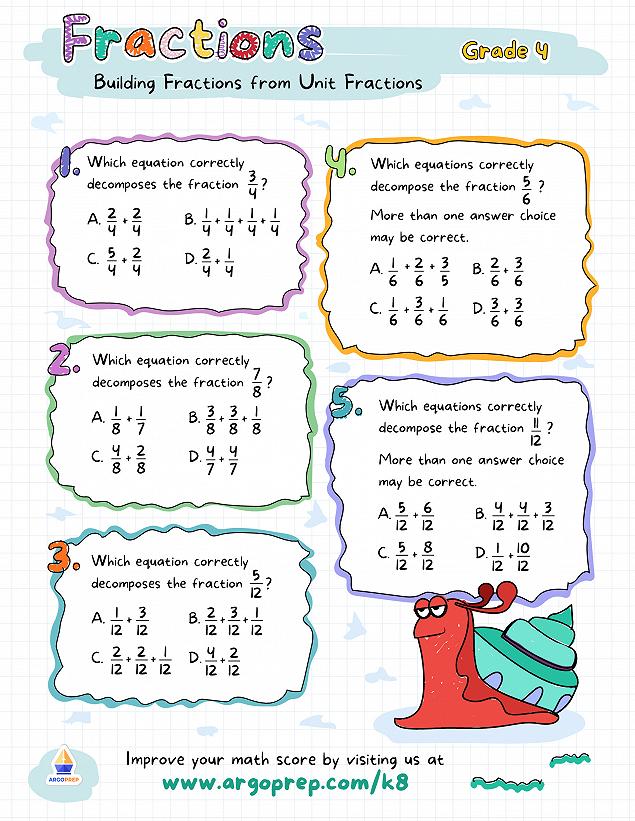 Decomposing fractions using tape diagrams. Test your math skills with these worksheets. Choose from different levels of difficulty and languages, and see your results. Showing 8 worksheets for decomposing fractions.