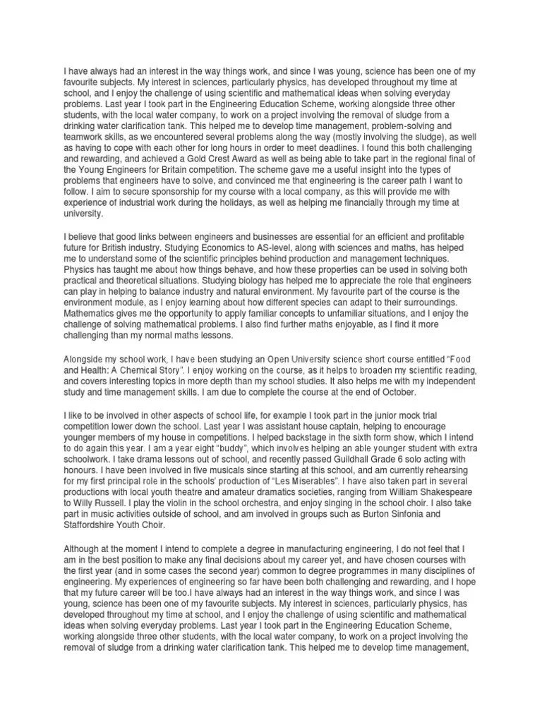 Discover expert advice from successful oxbridge applicants to write a flawless personal statement. The document contains two examples of engineering personal statements. Engineering personal statement example 1 “i believe this is an incredibly exciting and empowering subject that will allow me to make a difference to the world and change.