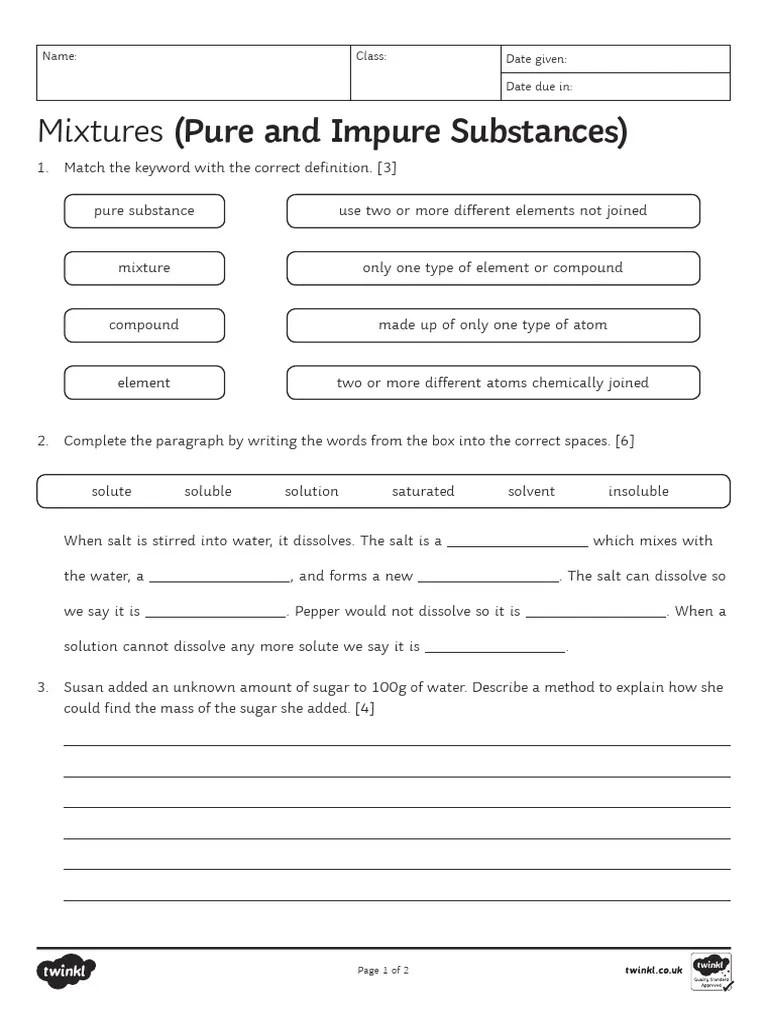 Students will identify pure substances and mixtures and explain the difference between them. Fill in the blanks where necessary. A pure substance is something that is made up of only one type of particle. This worksheet is great for science class practice, a quick assessment tool, a quiz, a science.