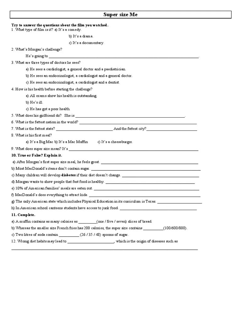 A worksheet about the movie supersize me + a reading comprehension. This is a free printable worksheet in pdf format and holds a printable version of the quiz super size me, test. A worksheet based on the documentary supersize me! this worksheet is divided into six part which correspond to.